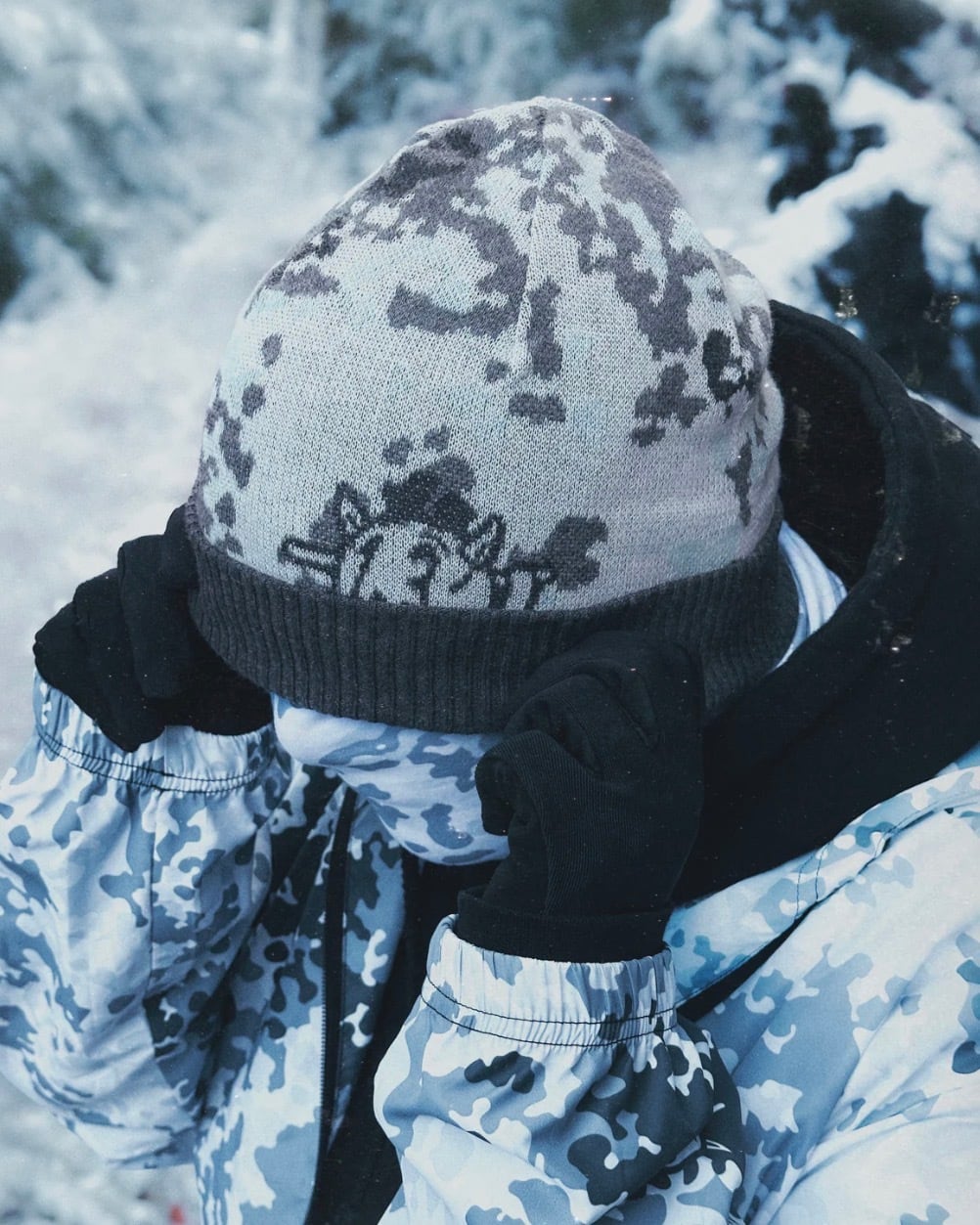 ドイツ軍の迷彩として知られる「フレックターン」を落とし込んだ、カフ付きニットビーニー。